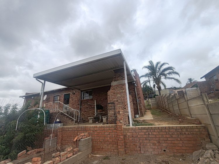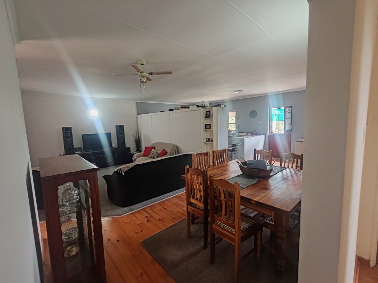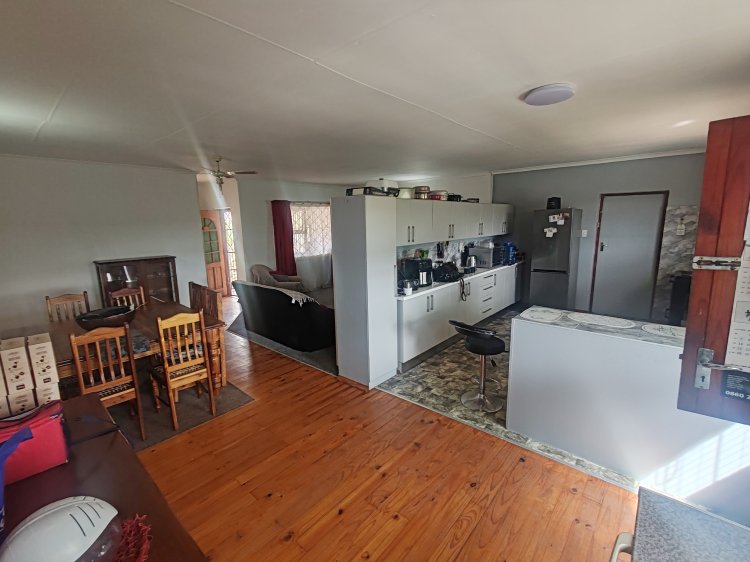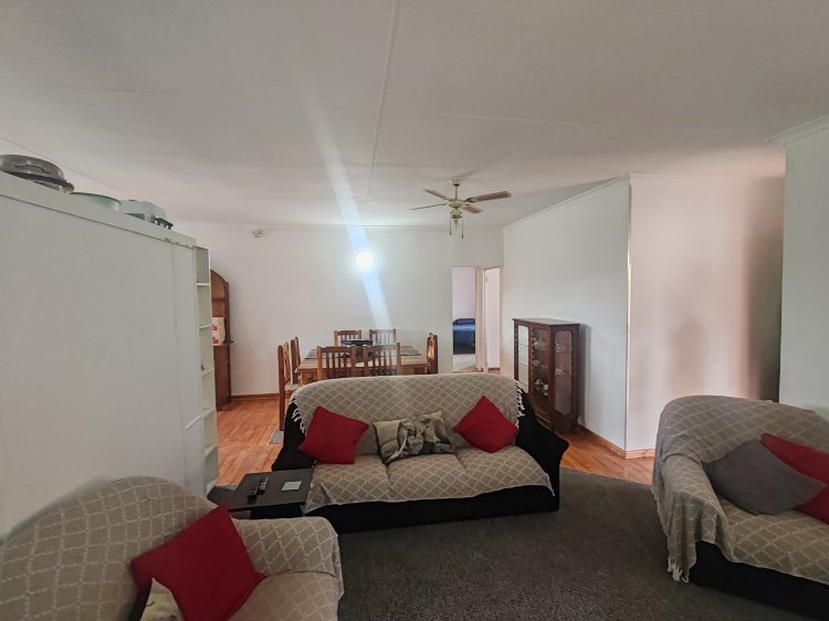 The kitchen leads out to a stoep with a built-in braai area, ideal for entertaining. A double tandem garage provides direct access into the kitchen for added convenience. The property is also equipped with a 1,500L JoJo water tank which is connected to the property.