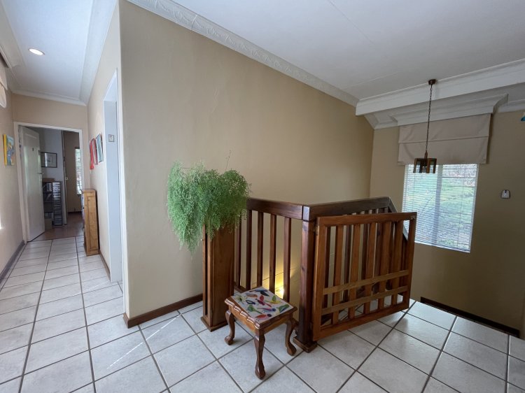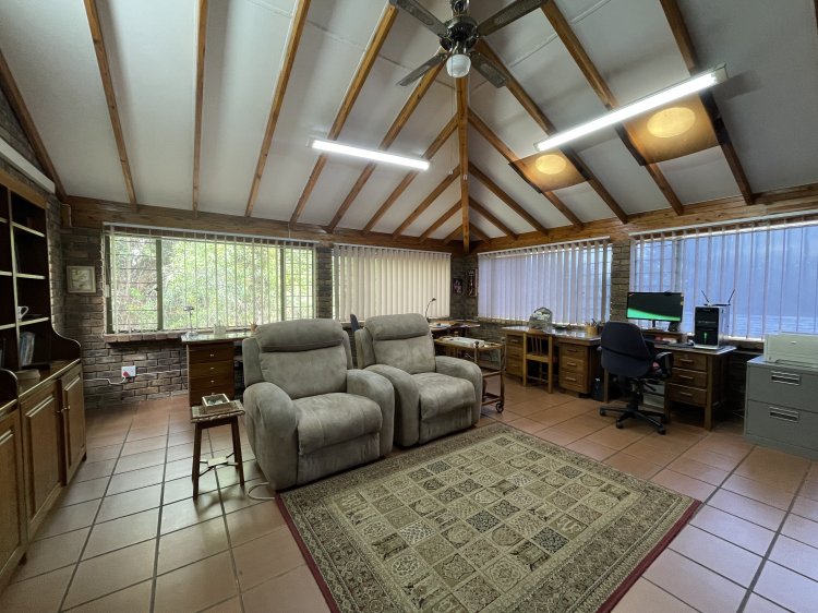 Upstairs, two bedrooms share a well‑appointed bathroom. The master suite offers a private balcony and an en‑suite bathroom — a quiet sanctuary elevated above the treetops. An additional room currently used as a study adds versatility, with exciting potential to transform into a stylish indoor braai or entertainment space.