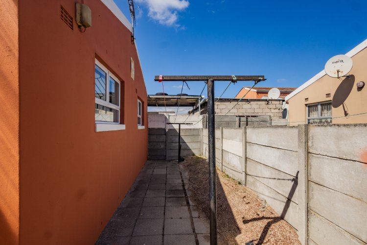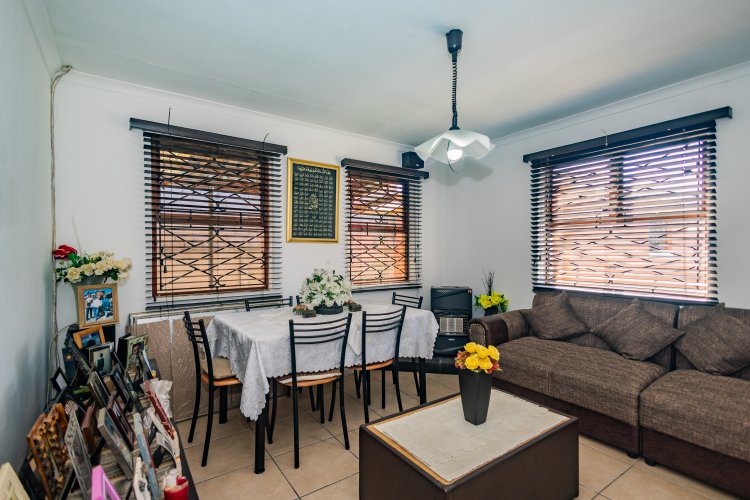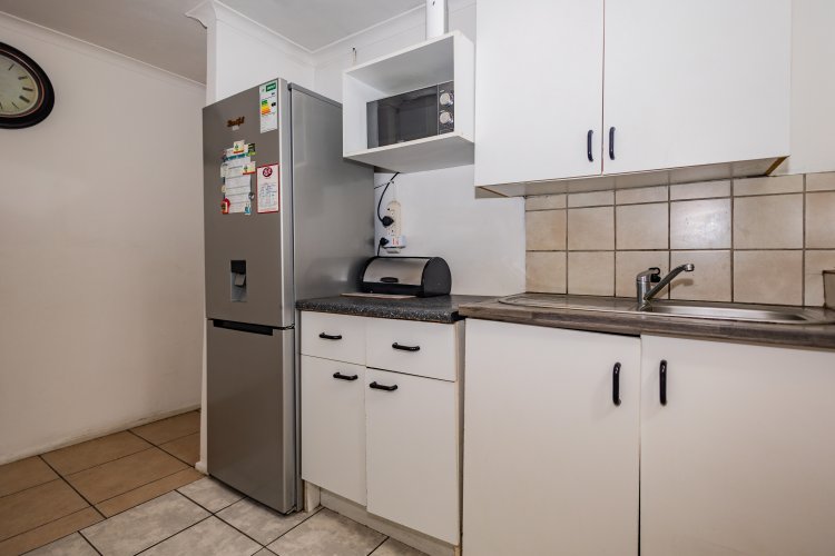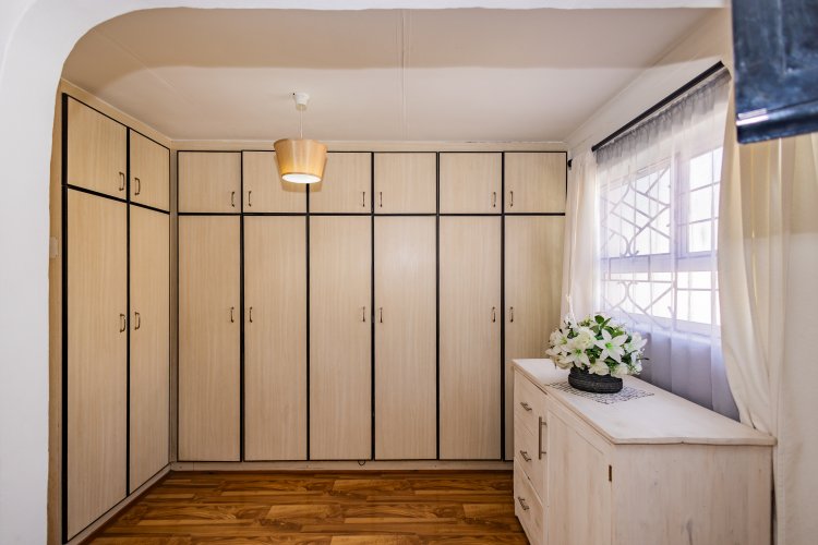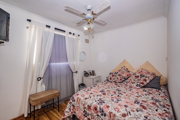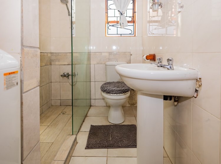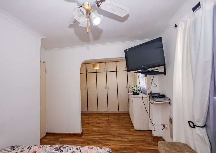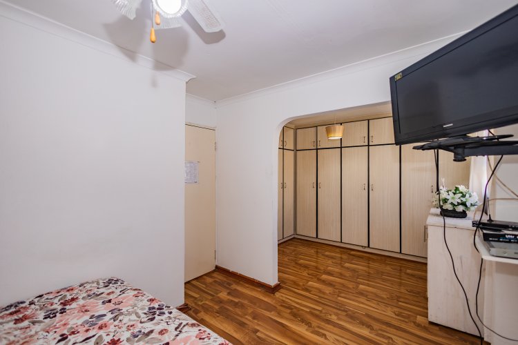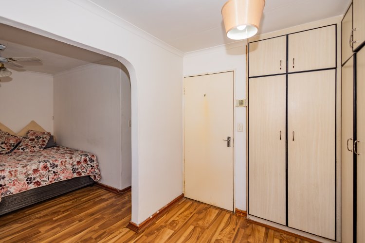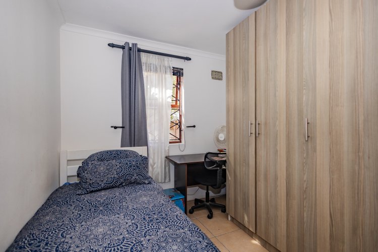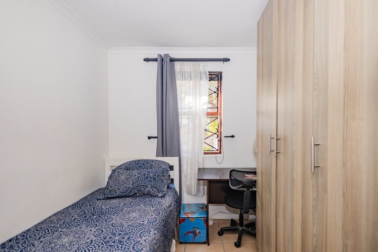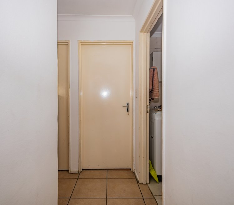 All bedrooms are well-sized. The main bedroom offers laminated flooring, a ceiling fan, and generous walk-in cupboards with 16 cupboard doors. The second bedroom includes built-in cupboards, burglar bars, and blinds, while the third bedroom is ideal for family or guest use. The bathroom has been upgraded with a walk-in shower, new basin, toilet, and plumbing points for a washing machine.