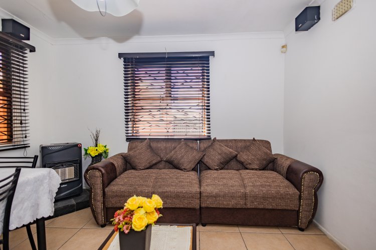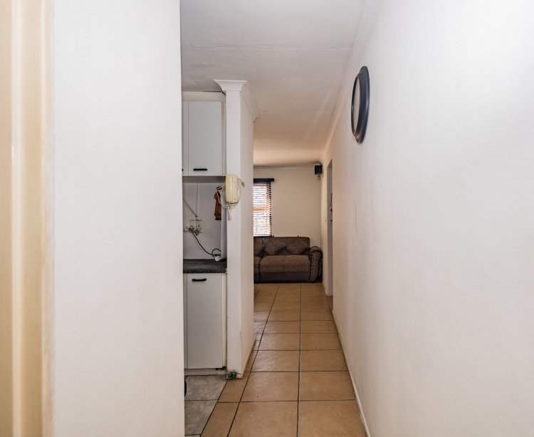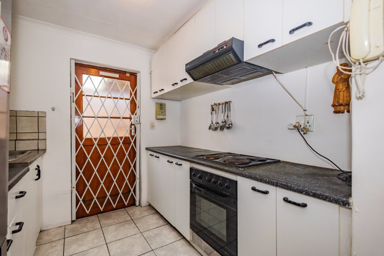 The home features a spacious tiled lounge fitted with wooden blinds, burglar bars, and a retractable light fitting, creating a warm and inviting living area. The modern kitchen is equipped with built-in cupboards, an electric stove, and extractor fan, offering ample storage and functionality.