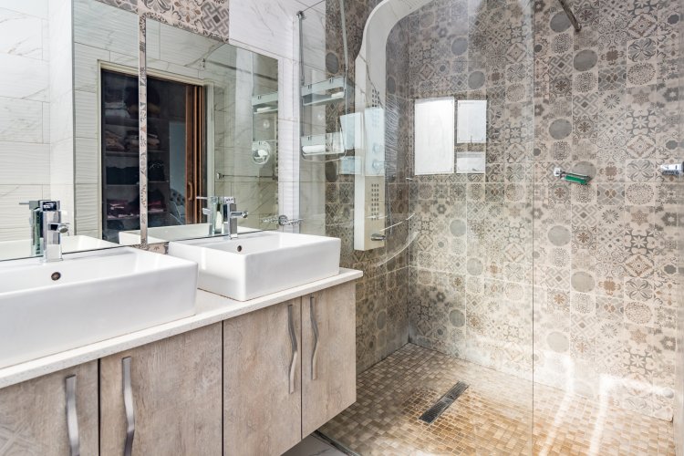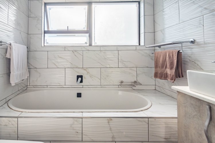 The residence offers three spacious bedrooms, all fitted with built-in cupboards. The main bedroom features an en-suite bathroom, while a full family bathroom—comprising a bathtub, shower, basin, and toilet—services the remaining bedrooms. A separate guest toilet adds further practicality.