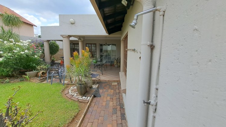 The covered patio overlooks a neatly landscaped garden, creating a tranquil outdoor space perfect for entertaining or unwinding in a secure estate environment.