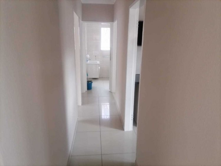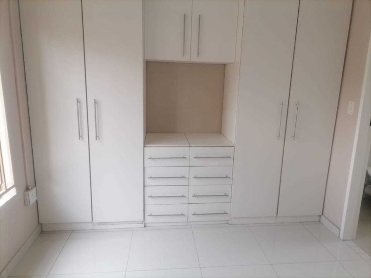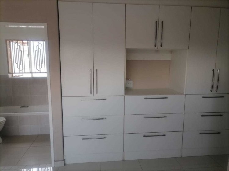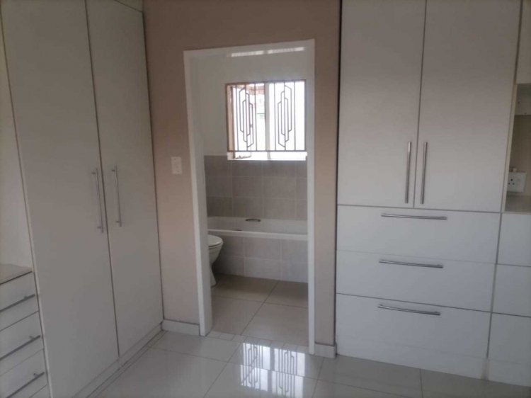All bedrooms are fitted with built-in cupboards, with the main bedroom offering the added convenience of an en-suite bathroom. The home features an open-plan dining and lounge area, creating a warm and inviting living space, as well as a kitchen fitted with stylish built-in cupboards.
