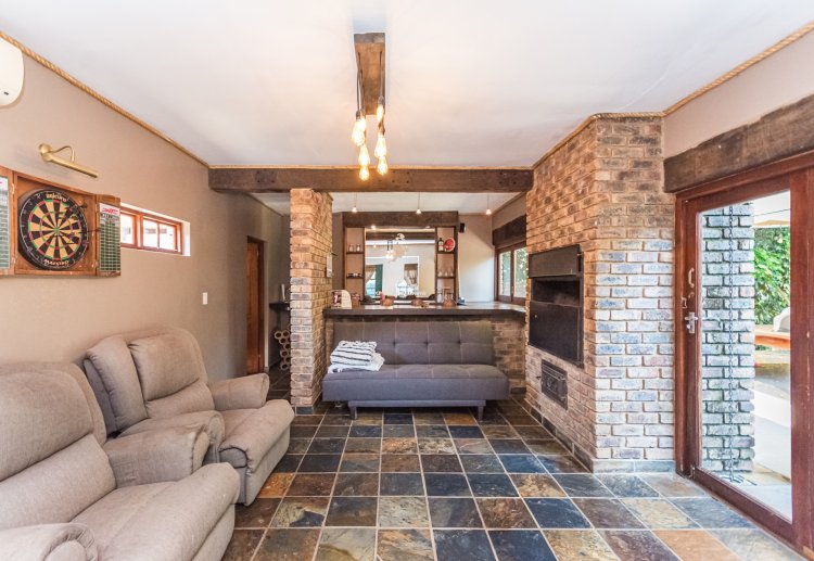 From the moment you enter, you are welcomed by a charming foyer that flows effortlessly into a generous open-plan living and dining area designed for easy living and relaxed entertaining. The space offers two comfortable living areas, one with a fireplace that warms up the entire open plan, plus another area featuring as a entertainment space with a built-in braai, aircon and bar, as well as a conveniently placed guest toilet. From here, wooden stack doors and wooden stack windows open onto a superb entertainment area and wooden deck, complete with a large table and ambient lighting, all included in the sale. Here you’ll also find a pizza oven, an outdoor built-in braai, and a boma — the perfect setting for hosting friends and creating unforgettable memories.