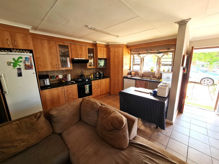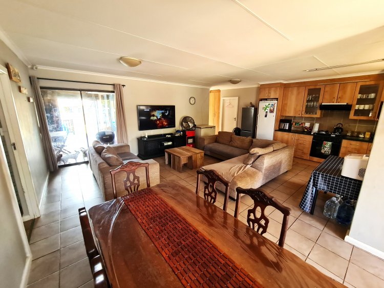Open-plan lounge, dining and kitchen areas. Tiles and laminate flooring throughout.