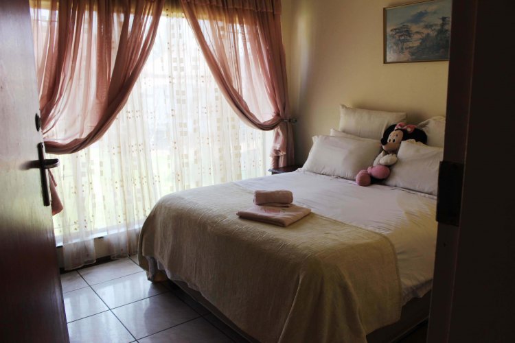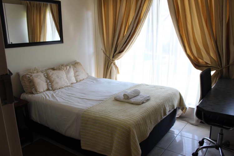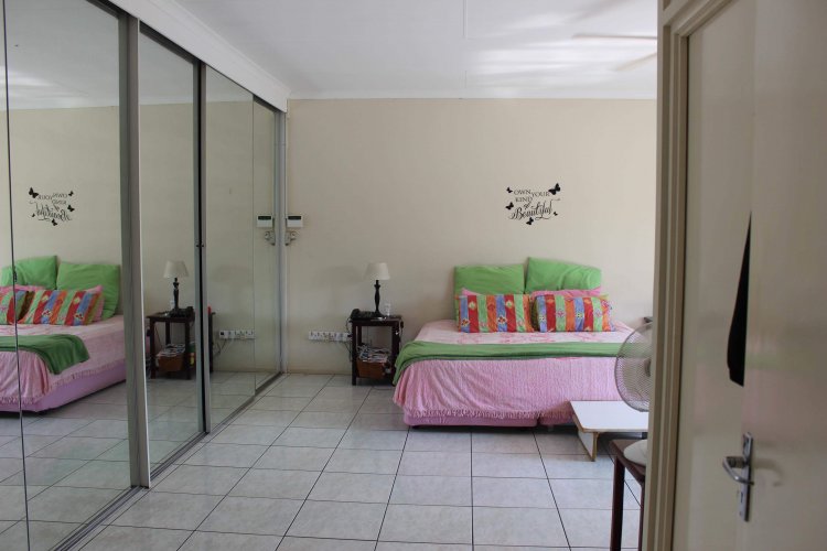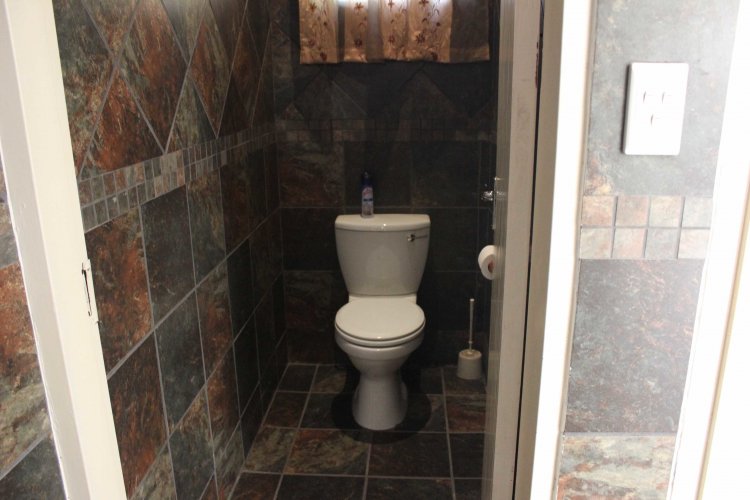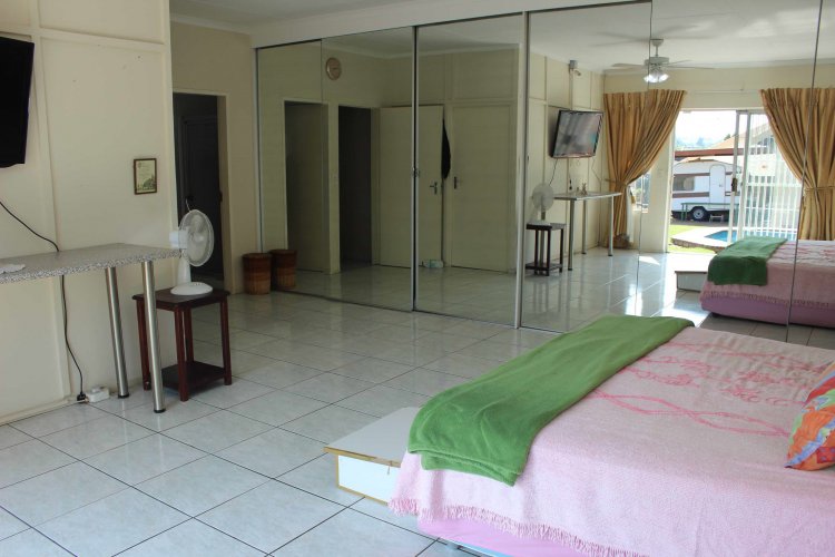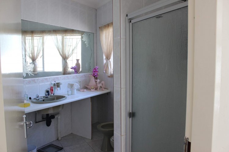 The main house welcomes you with a separate lounge, perfect for relaxed family living, while the large open-plan kitchen with elegant granite countertops flows seamlessly into the dining area, creating an inviting heart of the home. The property offers five well-sized bedrooms, all fitted with built-in cupboards, including an exceptionally large main bedroom featuring double mirrored cupboards and a private en-suite bathroom with shower, basin, and toilet.