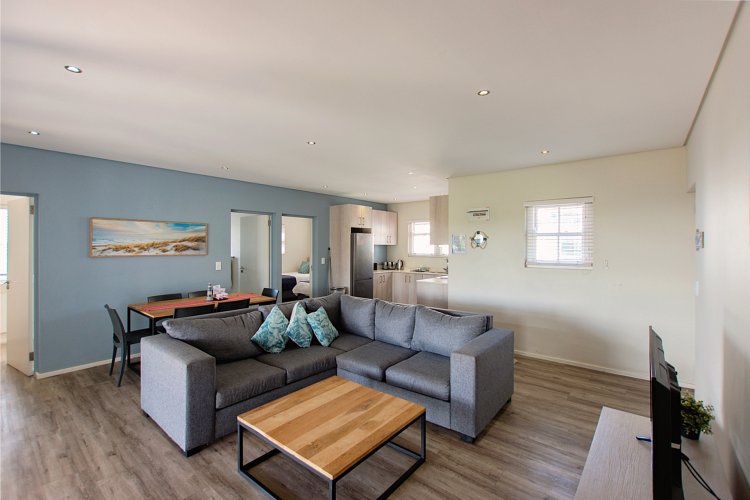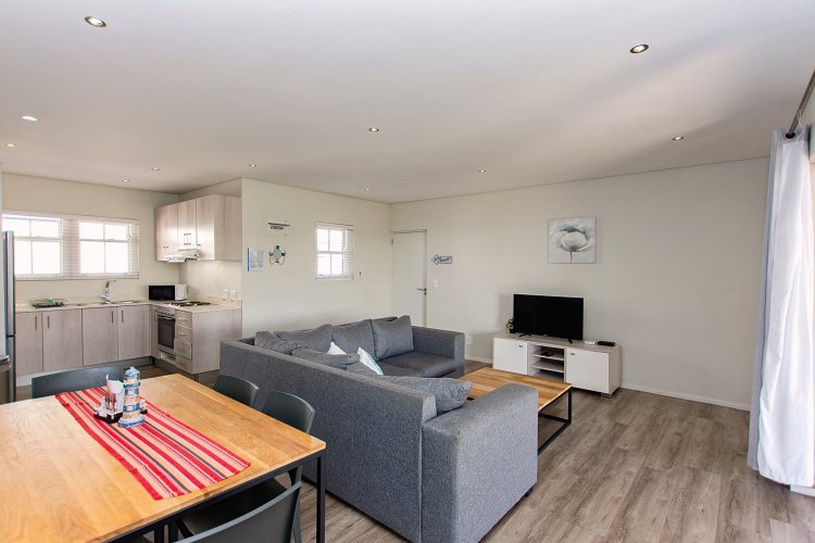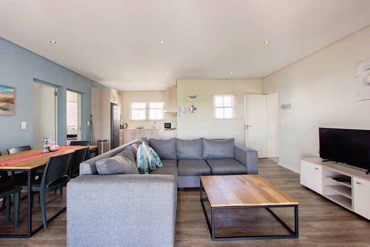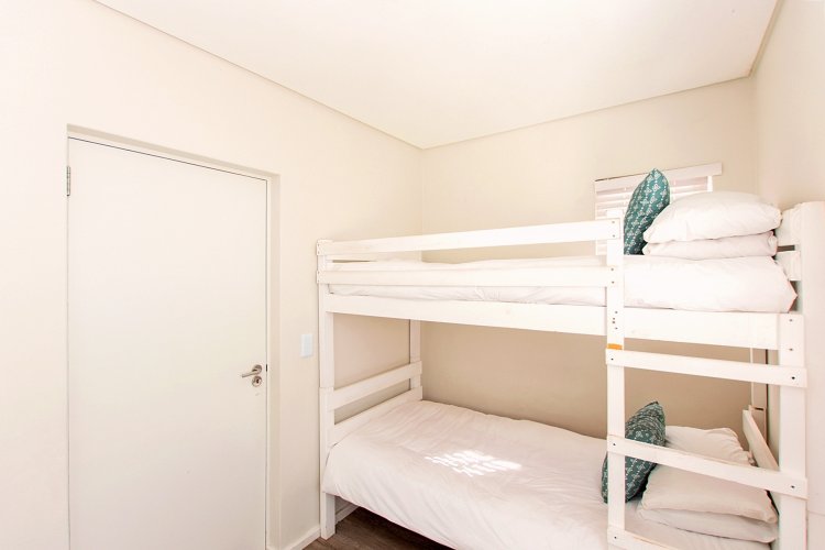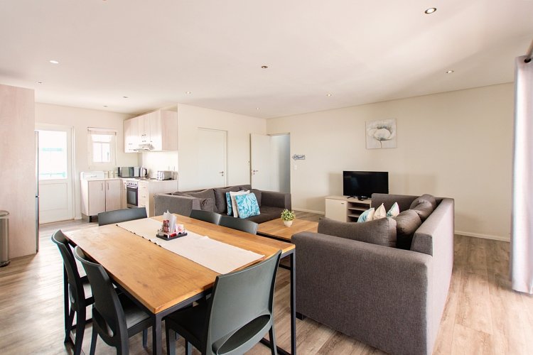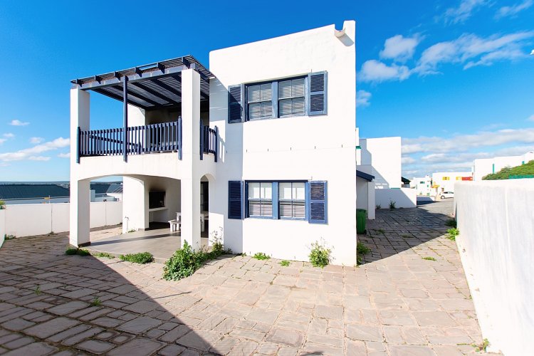 Featuring two storeys, each with private living areas, the lower level includes a open-plan living room, three bedrooms, a main bathroom, and an ensuite bathroom in the master bedroom. Enjoy outdoor living with a covered patio and built-in braai, ideal for summer gatherings.