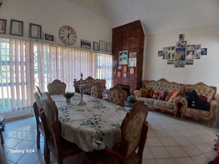 The dining area links the spacious lounge and the separate kitchen with modern finishes. The outside buildings include a single lock-up garage and staff quarters with a toilet.