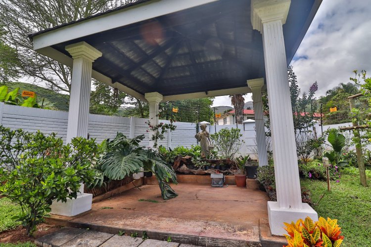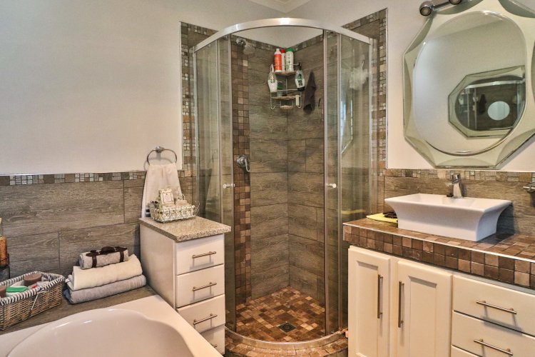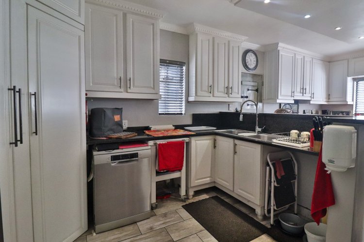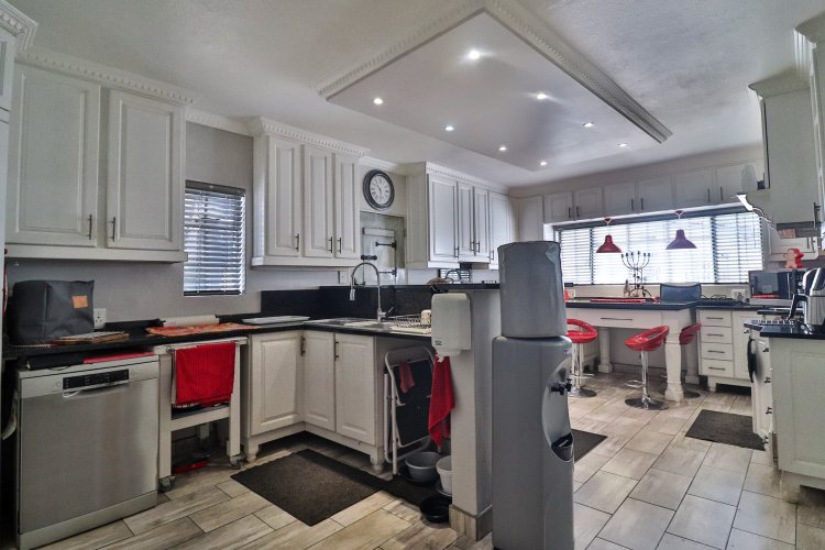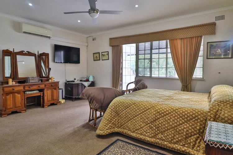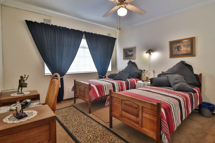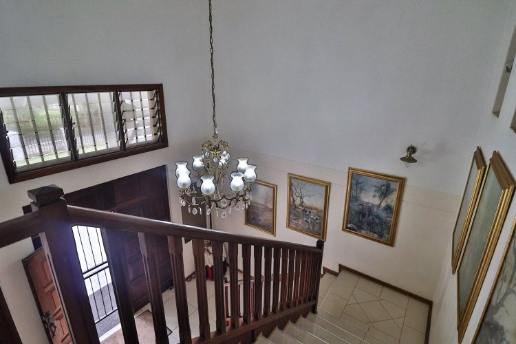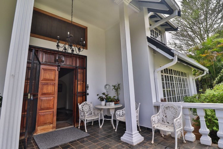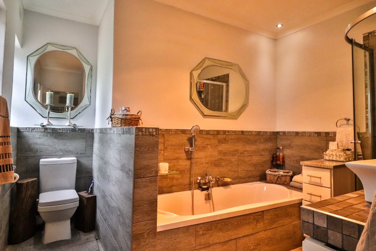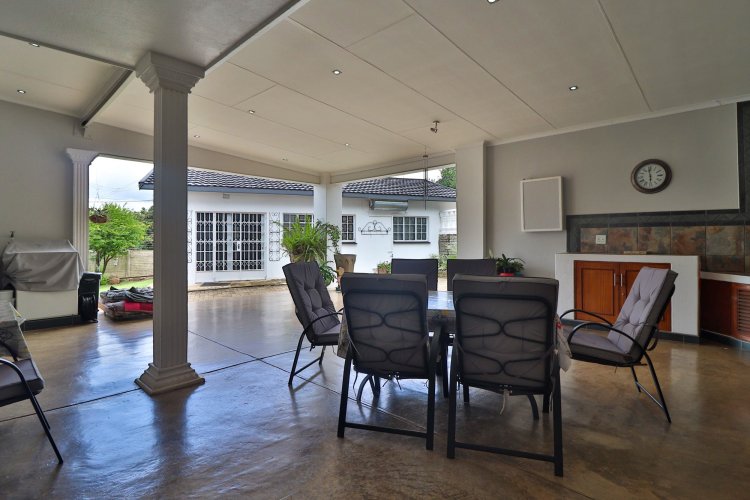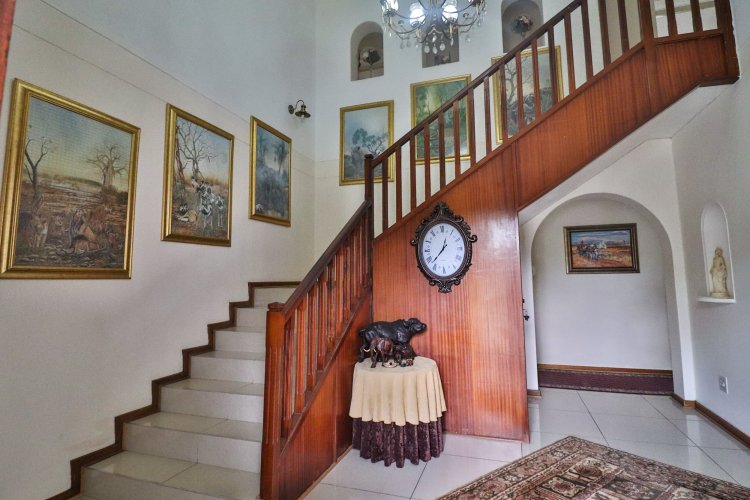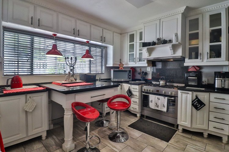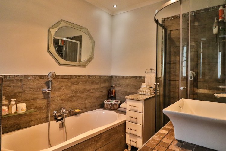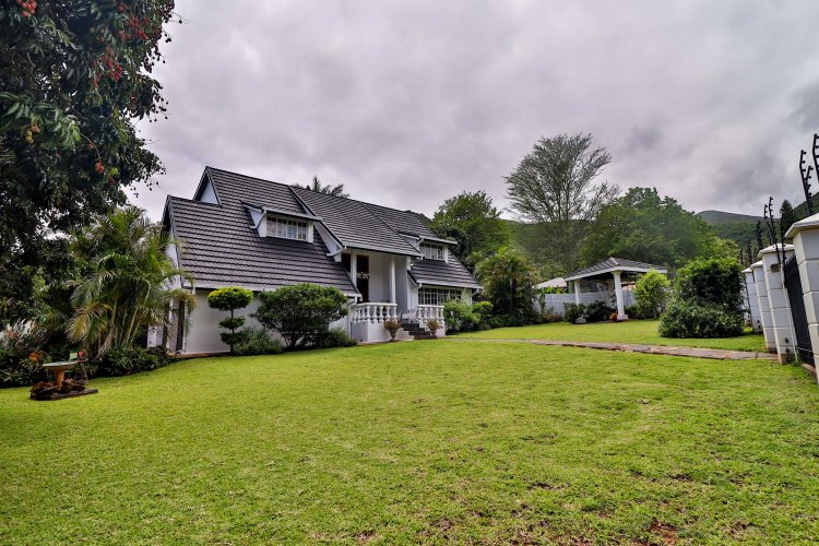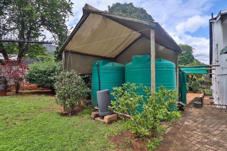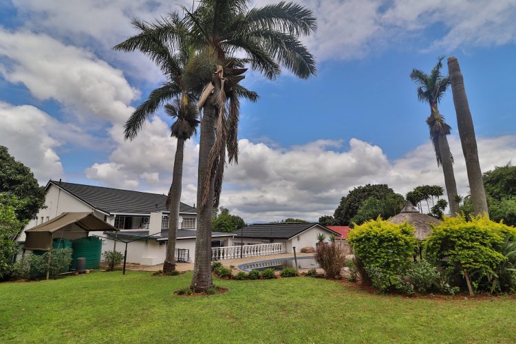 This extraordinary residence perfectly balances modern elegance, sustainability, and timeless charm. Spanning two levels, it offers four spacious bedrooms upstairs, ensuring both privacy and comfort. The main suite features a luxurious en‑suite bathroom and a balcony with breathtaking mountain views, an idyllic setting for peaceful mornings. The upper-level bathroom retains its original floor and wall tiles, adding character and a touch of history to the home’s refined aesthetic, while a guest toilet on the lower level provides convenience for visitors. The layout is designed for seamless living, with a showpiece kitchen flowing into inviting dining and lounge areas. Both spaces open onto a large covered entertainment patio, complete with a built-in braai and outdoor kitchen with cupboards, creating the perfect environment for stylish gatherings. Beyond its interiors, the property embraces eco-friendly, self-sufficient living. A private swimming pool set within a lush garden offers tranquility, while a vegetable tunnel connected to the borehole water system provides fresh, homegrown produce year-round. The borehole supplies the entire home, eliminating reliance on municipal water, and a state-of-the-art solar system with sixteen panels ensures complete off-grid energy independence. Adding further versatility, a modern one-bedroom flat offers its own elegant bathroom, open-plan lounge, and fully equipped kitchen, making it a self-contained retreat for guests or extended family. Vehicle storage is effortless with a double lock-up garage and covered parking for four, while security is assured through electric fencing and a comprehensive alarm system. This home is more than a residence—it is a sanctuary where luxury, sustainability, and natural beauty converge. A rare gem that delivers comfort, independence, and style in perfect harmony.