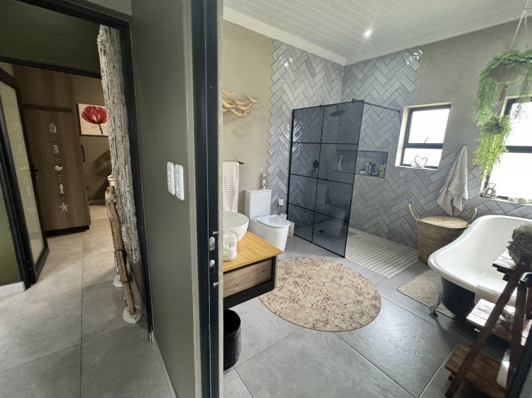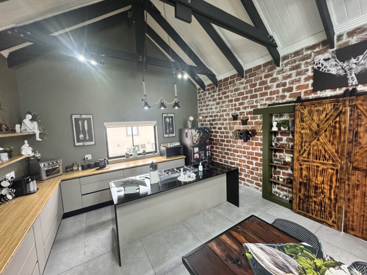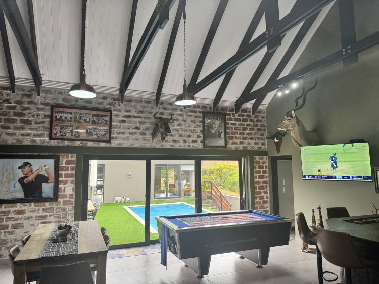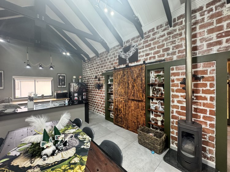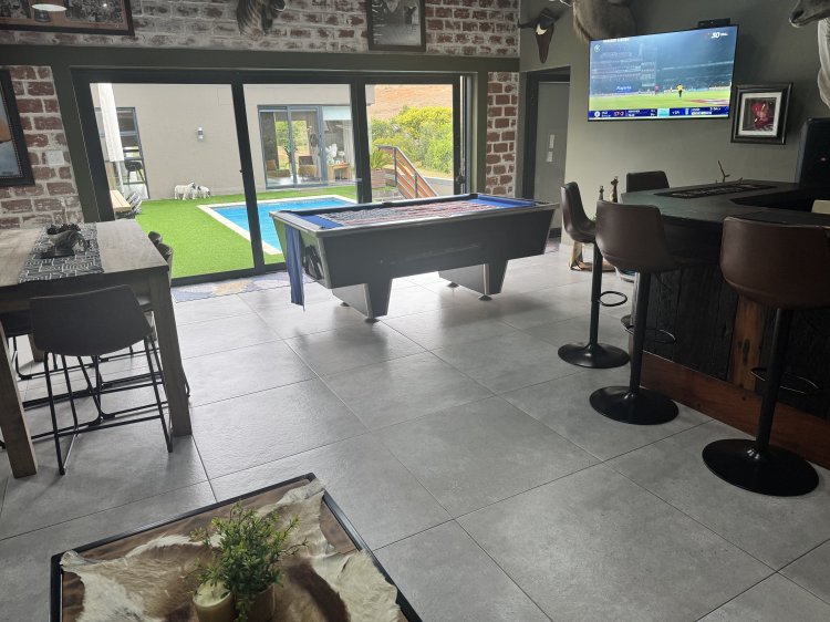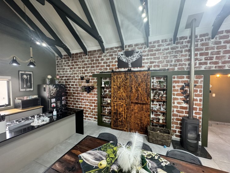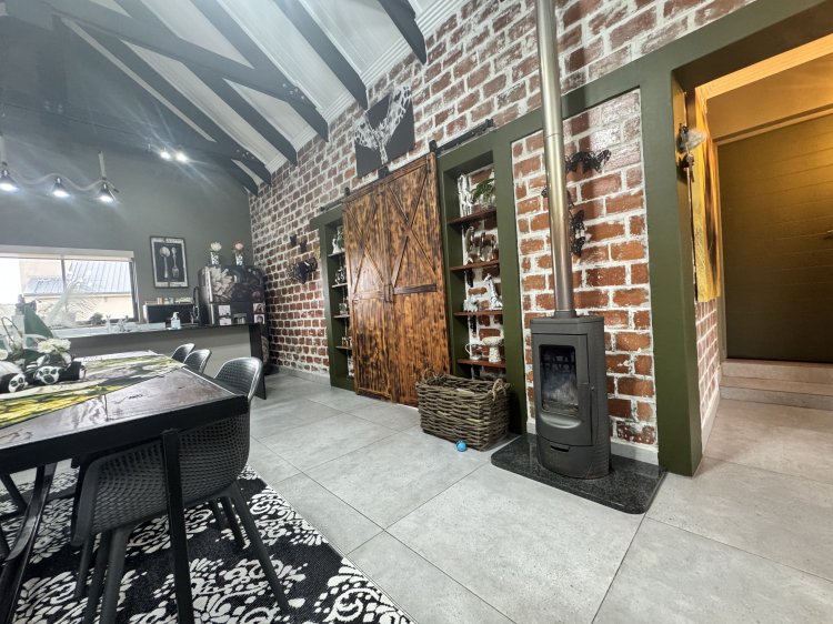 Step indoors and prepare to be impressed: Open-plan living with a indoor fireplace An entertainment room complete with bar and built-in braai A modern kitchen with scullery, pantry and storage galore