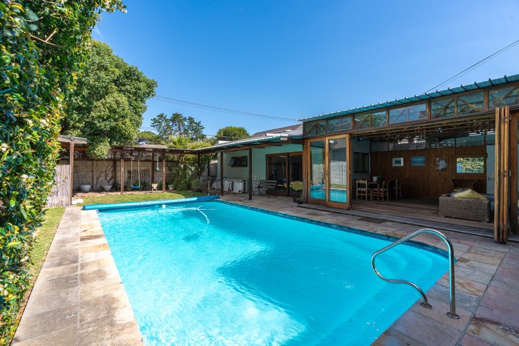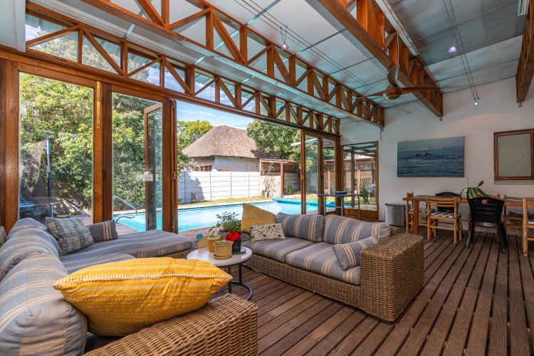 The main house features open-plan living areas, a separate TV lounge or downstairs bedroom, and a modern open-plan kitchen that flows to a covered, fully enclosed patio with stack-back doors overlooking the pool and rear garden—perfect for all-weather entertaining.
