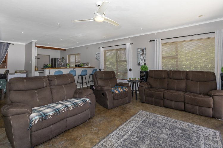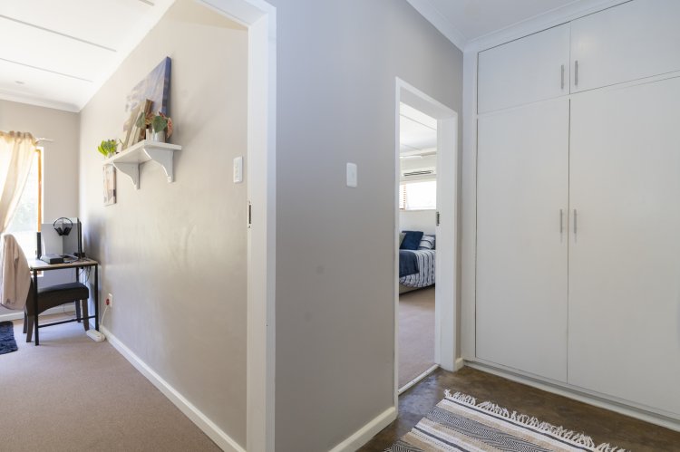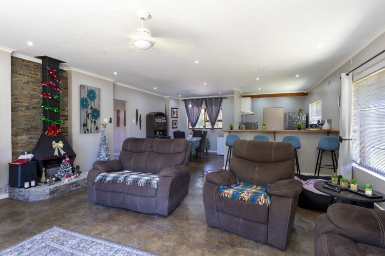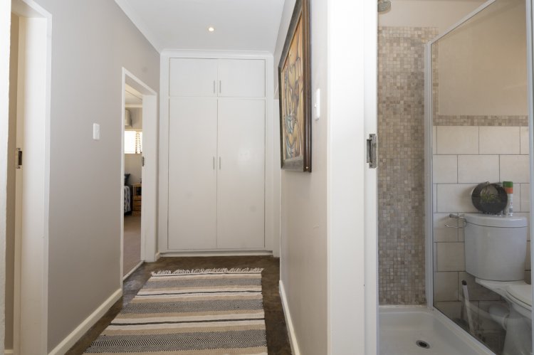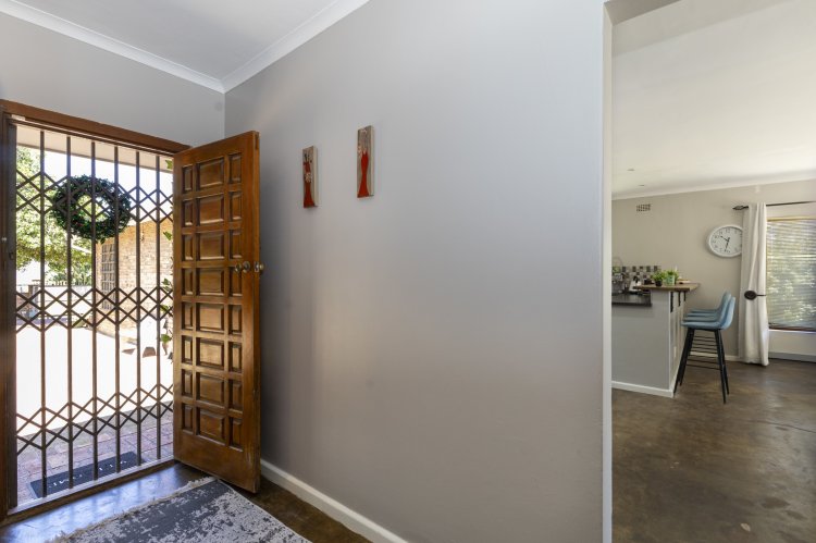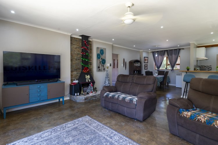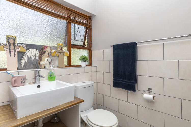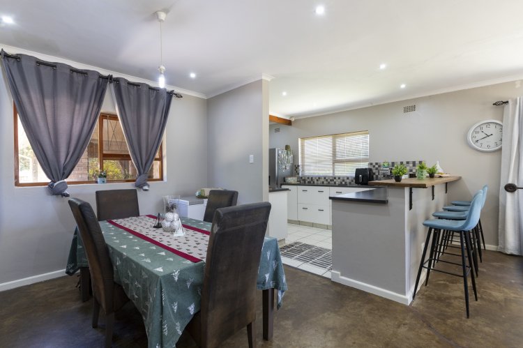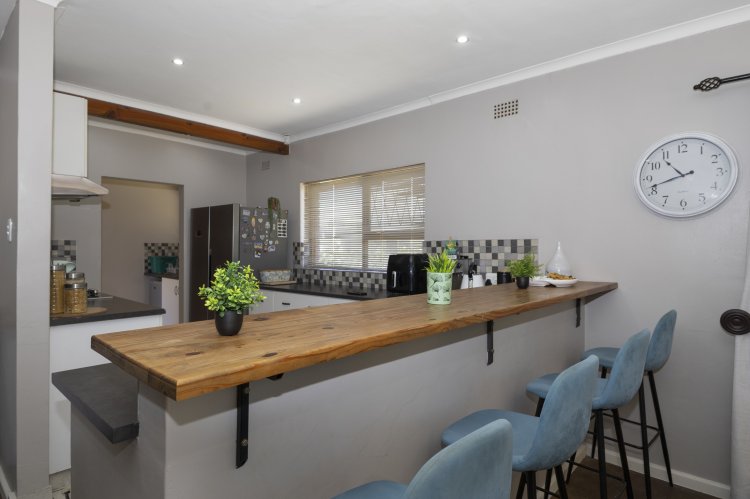 Set within a lush, enclosed garden, this charming home offers an inviting open plan design that includes a warm, welcoming living area, three generous bedrooms, and two beautifully appointed bathrooms. The kitchen, fitted with an undercounter oven and gas hob, flows effortlessly into the lounge and dining space, perfect for easy living and entertaining. Sleek screeded floors and an open wood fireplace add character and comfort to the living area. The main bedroom enjoys its own en suite, while a full family bathroom serves the remaining bedrooms, all of which feature built-in cupboards. Broad sliding doors open the home to an east-facing, tree-lined garden that enhances the sense of space and tranquillity. With an alarm system, a spacious single garage, and a practical scullery, this property offers an ideal blend of comfort, style, and location.