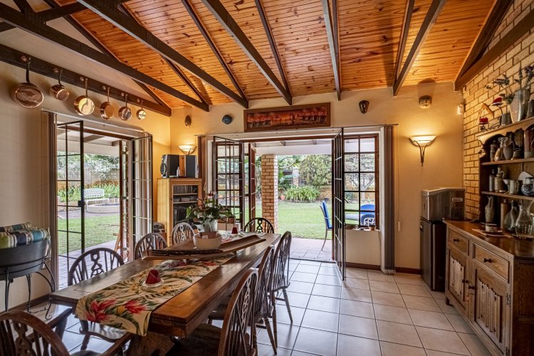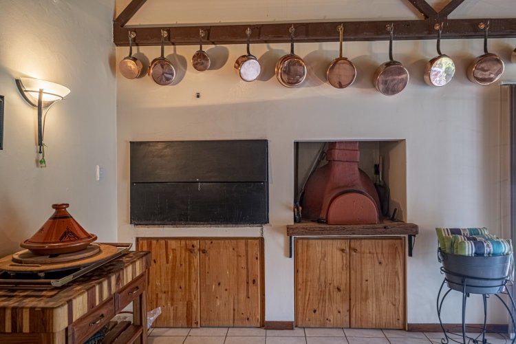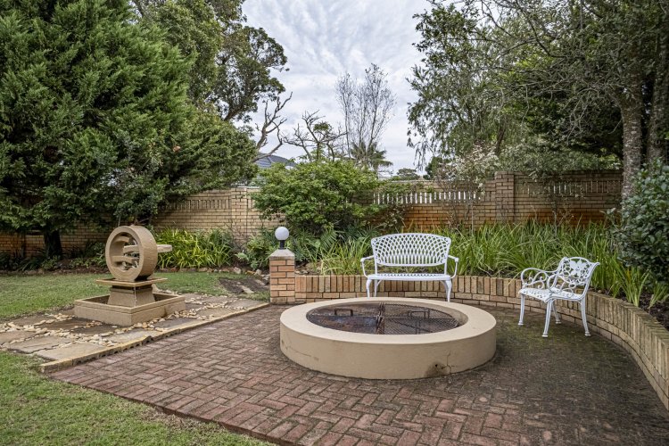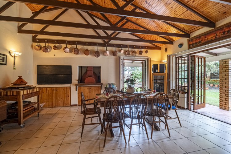 A large entertainment room with an indoor braai and pizza oven, flowing onto a covered patio and outdoor fire pit area—tailor-made for year-round gatherings.