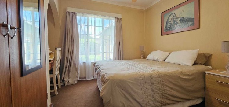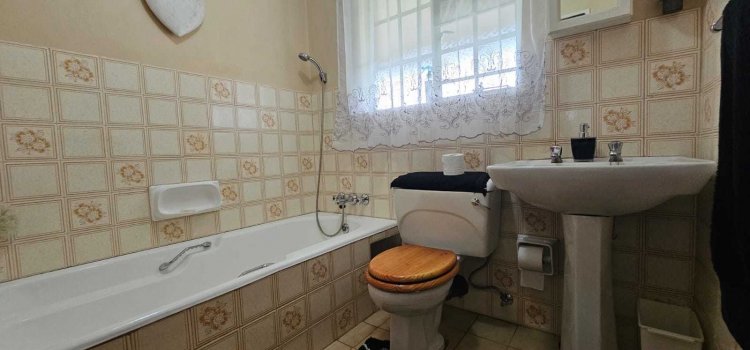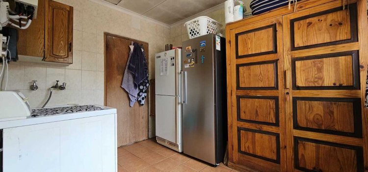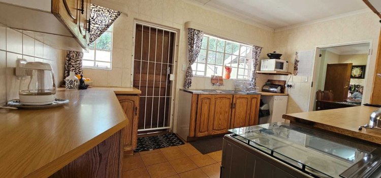 At the heart of the home sits the large kitchen, complete with beautiful wood cupboards, ample prep space, and a gas stove for easy cooking during load-shedding. A separate laundry room provides additional appliance space, keeping your kitchen organised and functional.