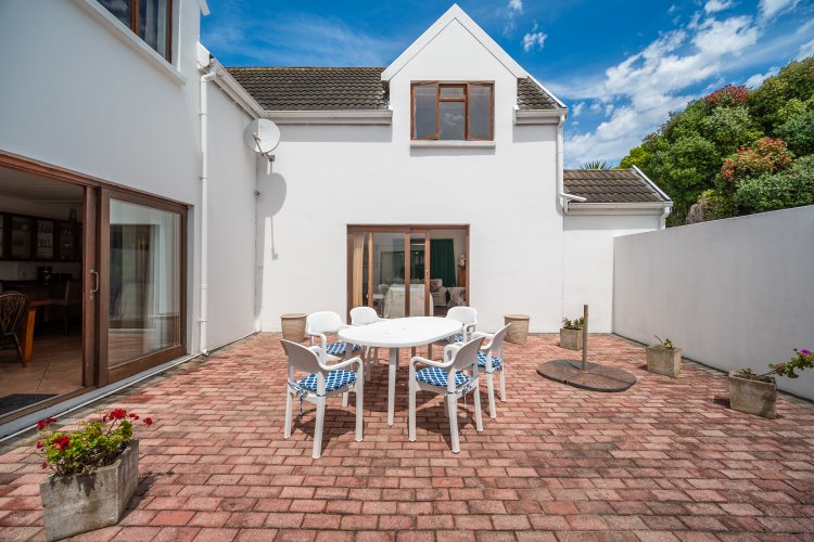 The kitchen, fitted with granite tops, flows into the dining area to create an easy, open-plan space that leads out onto a sunny patio. From here, you can take in serene golf course views as well as enjoy direct access to the enclosed courtyard — a sheltered, private space complete with its own built-in braai, perfect for relaxed outdoor living and entertaining.